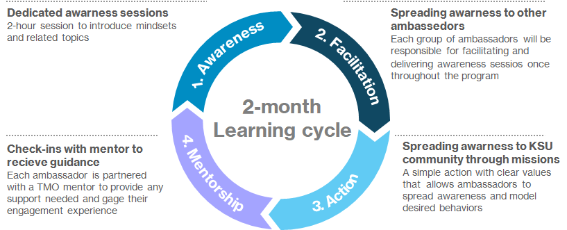 Over an 8-month journey, ambassadors are supported, trained, and empowered through key change mindsets to become vibrant changemakers at KSU. Through this program, ambassadors undertake four 2-month learning cycles.